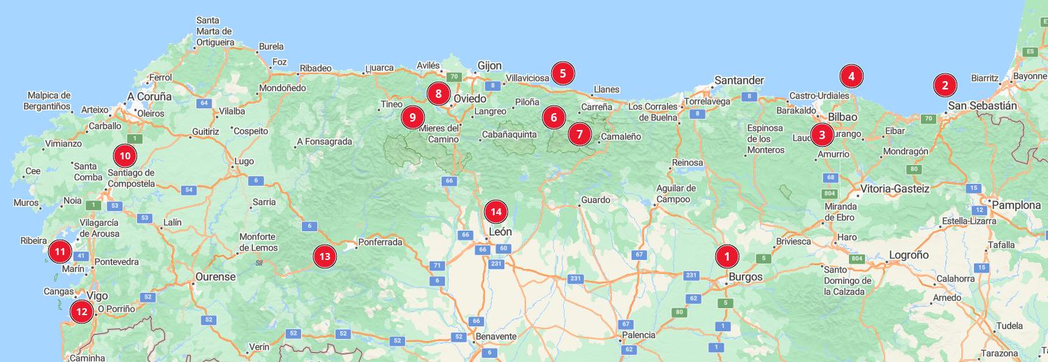 1. Burgos, 2. San Sebastián, 3. Bilbao, 4. Gaztelugatxe, 5. Ribadasella, 6. Covadonga, 7. Bulnes, 8. Oviedo, 9. Tuñón, 10. Santiago de Compostella, 11. O Grove, 12. Vigo, 13. Las Medulas, 14. Leon